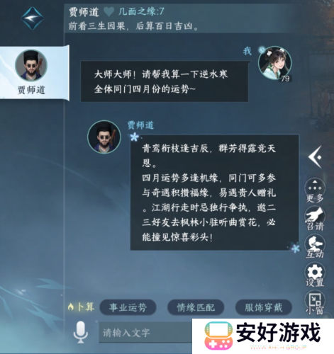比如,新版本增加了一个“赛博算命”玩法。官方介绍,全新卜卦NPC以满血版Deepseek为引擎,熟读《穷通宝鉴》《三命通会》《渊海子平》等经典书籍,懂得八字、卦象、六爻、六壬、**、万年历等专业玄学知识;并面向逆水寒手游的东方世界观进行了专题优化,堪称“权威赛博命理学大师”。据说还可以算现实中的正缘、气运、梦境。
