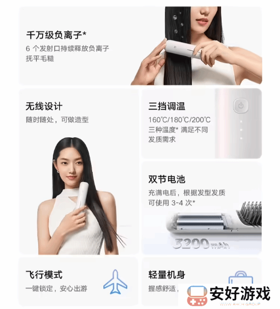 该产品内置“千万级负离子”,支持 160/180/200℃三挡调温,可放入包中、行李箱内,机身仅重 269g。