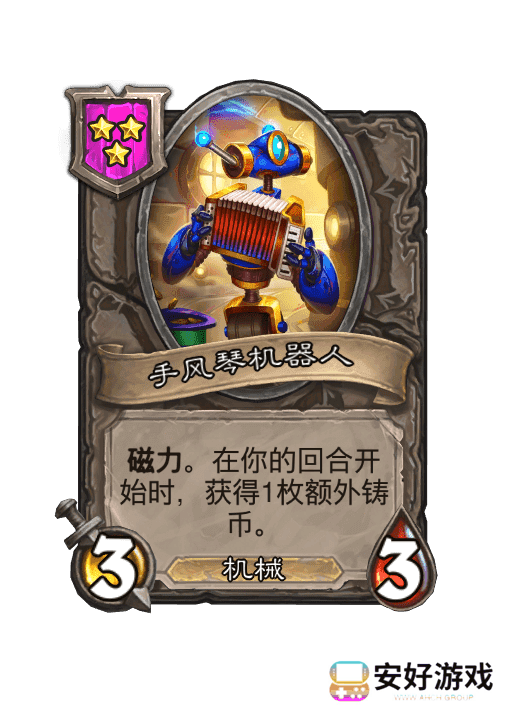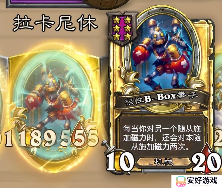 是这个流派最为关键的卡,也是流派名字的由来,效果是当你给另一个随从释放磁力,极性B-BOX拳手也会获得效果,金色之后是获得两次。也就是一张磁力随从,能够根据你极性B-BOX拳手的数量翻倍,来的越早越好,配合手风琴机器人,会有花不完的钱。
