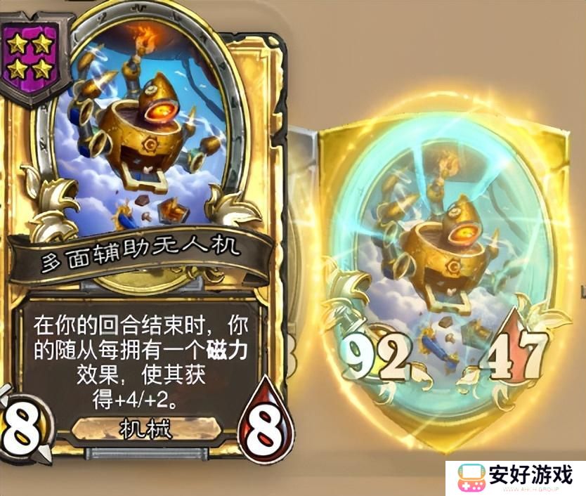 单纯靠磁力随从本身的身材确实还是有点不够看,需要搭配四本的多面辅助无人机,将堆叠的高层数磁力转化为身材和面板,普通每层+2/1,金色翻一番+4/2。核心极性B-BOX拳手在6本,中期还是得依靠多面辅助无人机养一个战力保血。