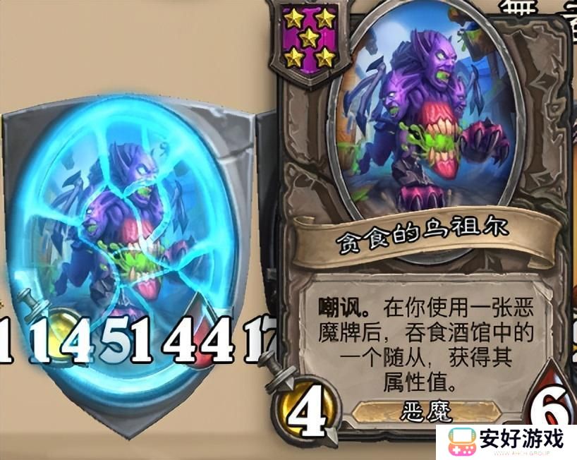 恶魔吞噬流最关键的卡片当属——贪食的乌祖尔,效果是在使用恶魔牌之后会直接吞噬酒馆中的一张随从,拿到这张恶魔卡之后,我们就可以通过不断地找恶魔牌和养酒馆随从身材,快速养大乌祖尔。