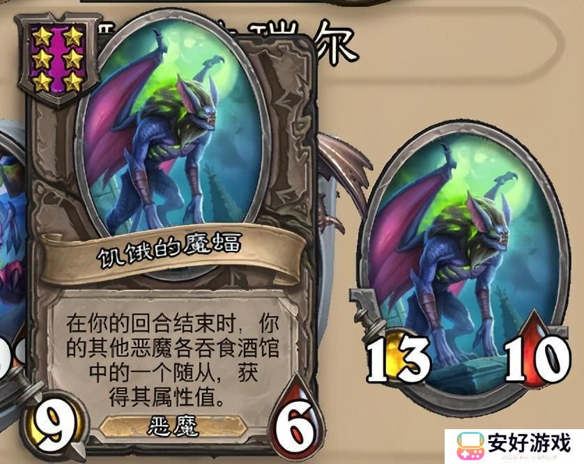 饥饿的魔蝠自身的效率还是有点低,不过拿来作为中途打工的随从还是不错的,效果是结束回合的时候,每个恶魔吞噬一次。上魔蝠会限制留牌,注意遇到关键随从的时候记得换下,同时自身是不会吞噬随从的,面板完全不够看,决赛的时候记得换下。