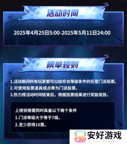 预选赛期间,游戏内门派热力榜助力同步开启,本次热力榜将持续至预选赛结束,玩家们可给自己支持的门派投票,榜单结束后,排名前两名的门派可获得门派联赛第六赛季·常规赛的参赛资格,同时门派内每人可获得一定数量的门派纹章奖励。投票期间,累计个人贡献排名前一百的玩家可获得弹幕彩笔、限时场景、游戏礼物等道具奖励。