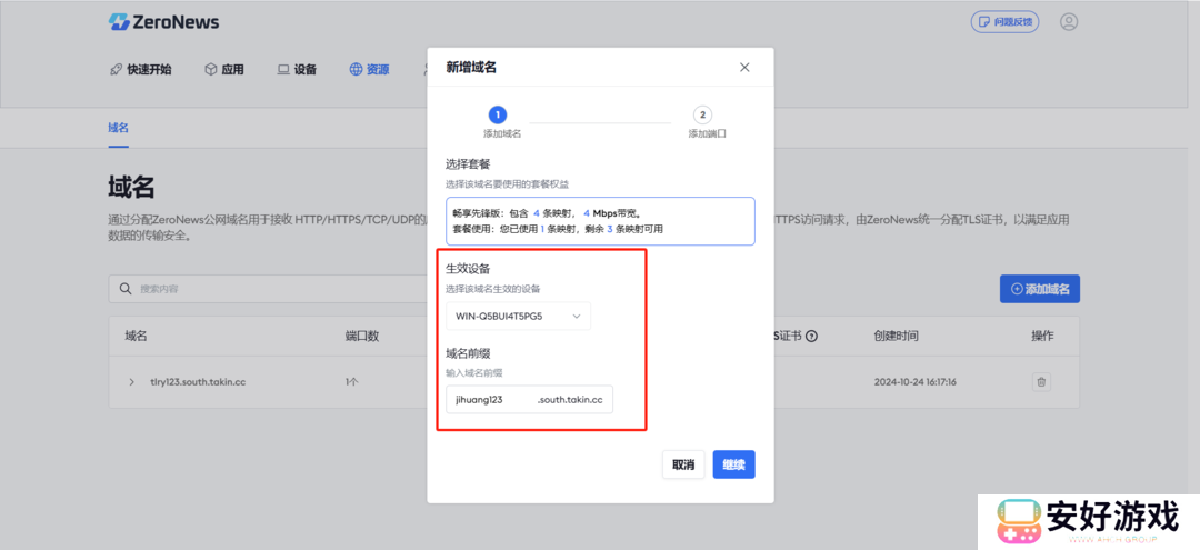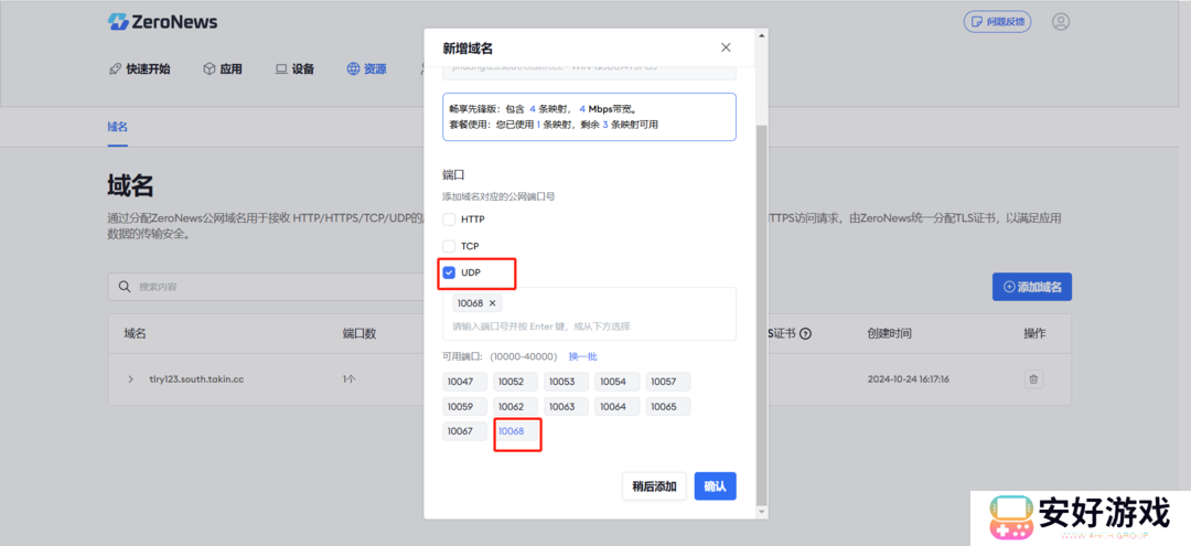 4、然后配置一个自定义域名,并勾选UDP端口,然后选择其中一个端口即可