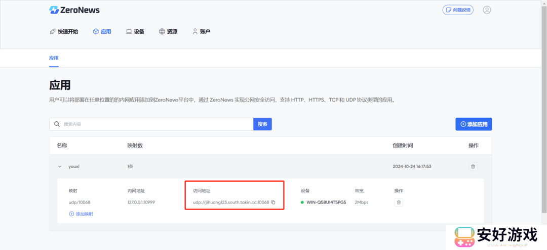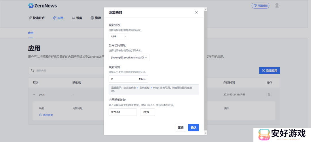 5、然后在应用里,配置映射:选择UDP协议,然后选择公网访问地址和输入带宽;然后选择内网地址,默认为127.0.0.1,端口输入为10999即可。