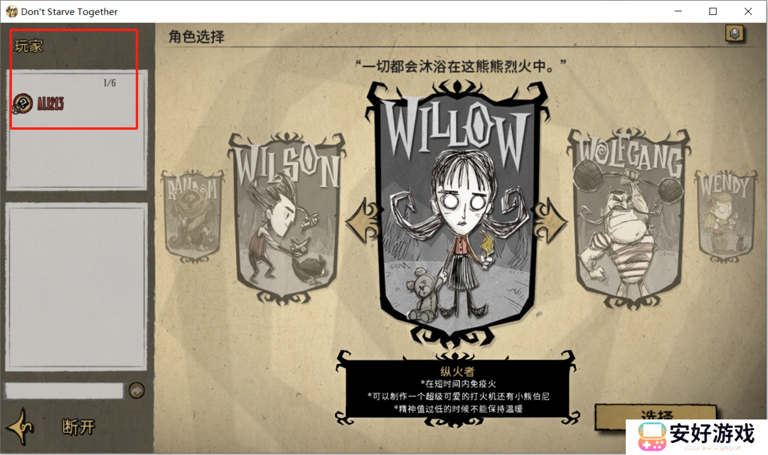 5、然后会进入到选择游戏角色的页面,可以看到右侧会提示玩家的数量,当然,现在只有你一个人。