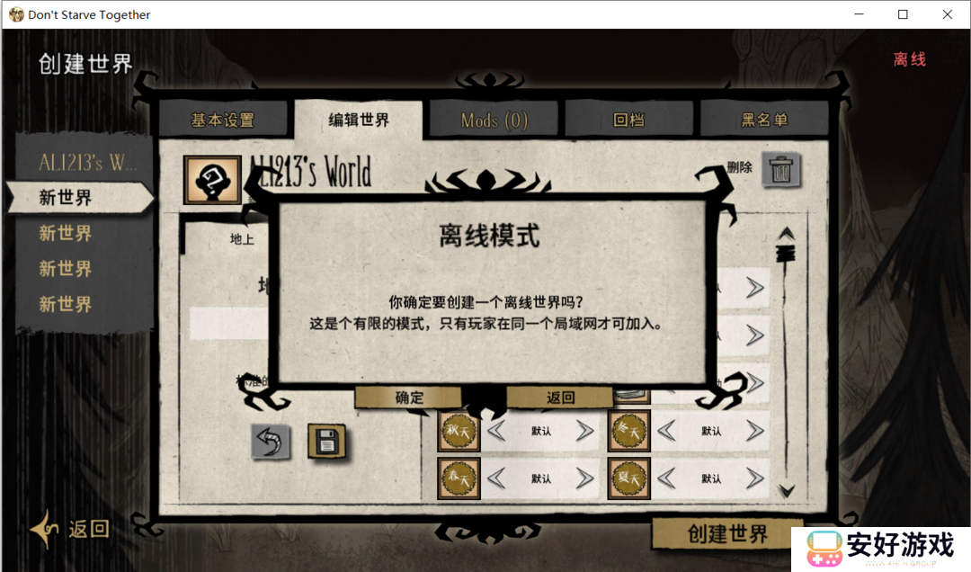 3、然后在打开“编辑世界”,生物群落选择 联机,其他的根据需要选择即可,另外,Mods也可以根据需求添加,和正常进入游戏一样。