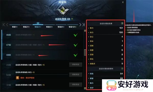 远征队等级提升会奖励一些属性,对该账号下所有角色有略微属性提升;