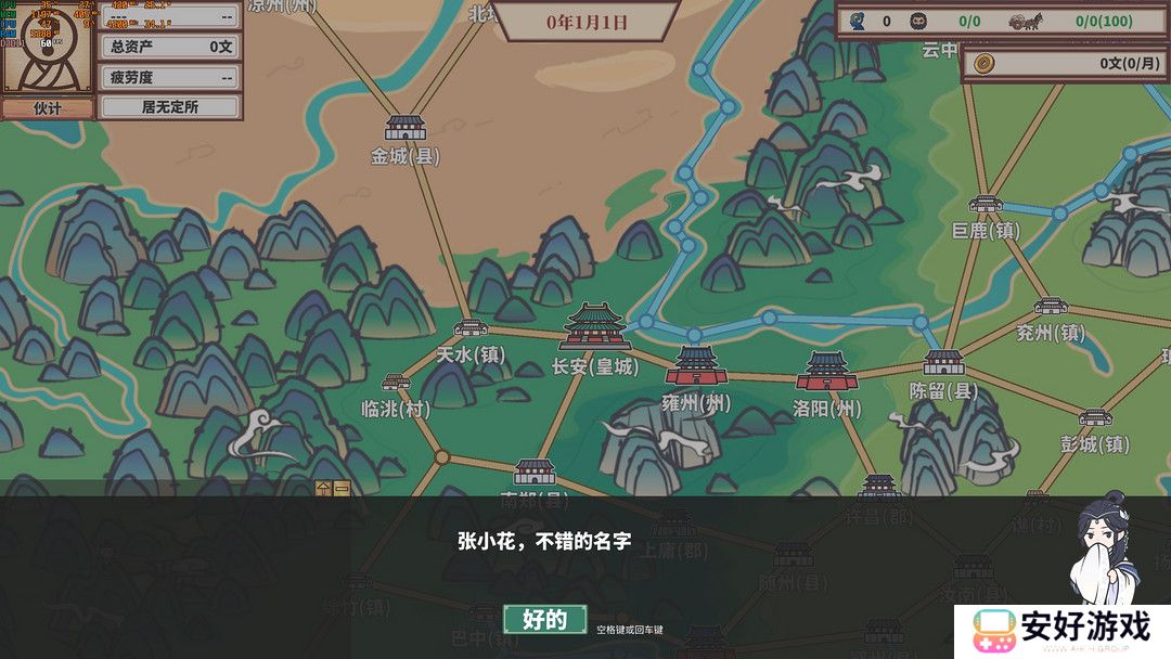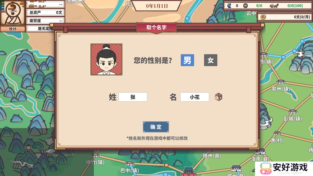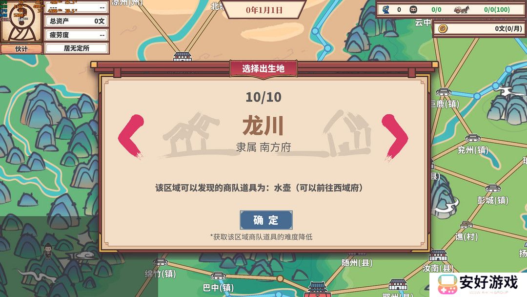 开局进入经典的起名环节,随便起了个名字后,从十个地方选取一个作为出生地,每个地方都有不同的特殊效果,这里我选择了可以前往西域府的特殊效果加成,看起来像是后期特别加成的效果。