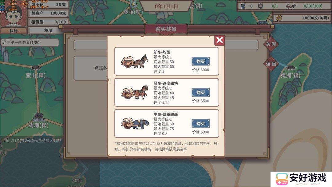 紧接着可以选择是否进入新手教程,先进入教程了解下游戏的主要玩法,第一个任务是购买一辆载具,直接在新手村的市场三选一入手载具,这里要注意初始状态只有1万文钱,三种属实载具的价格都差不多,每种有不同的属性偏向,我选了均衡类型的驴车。