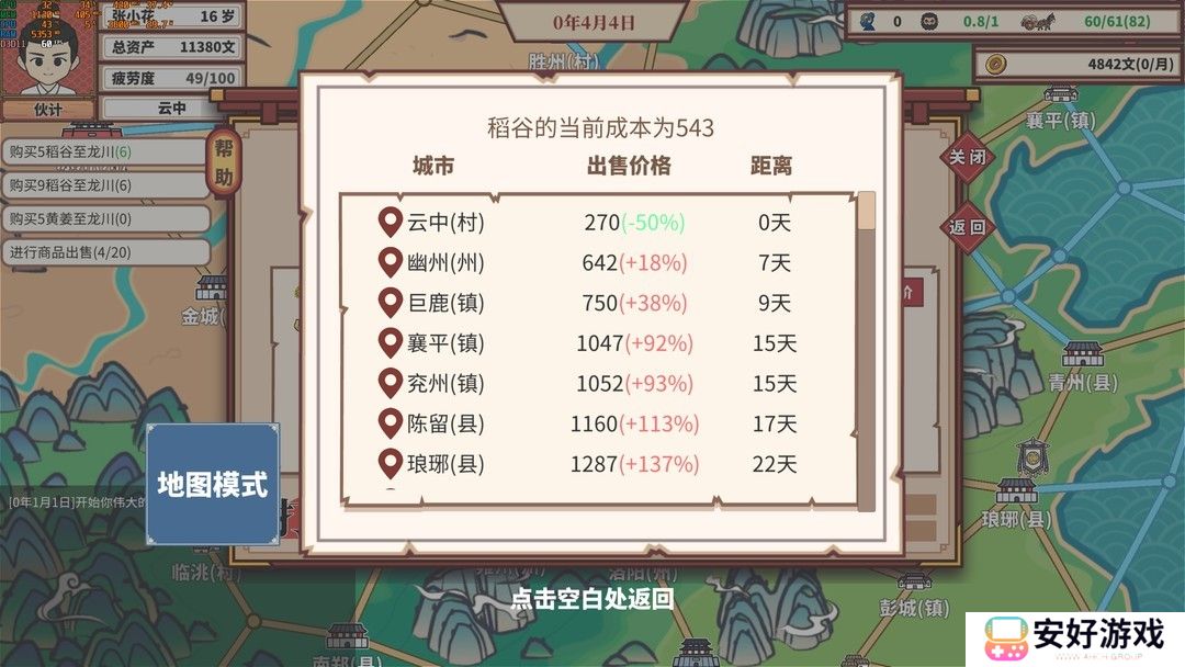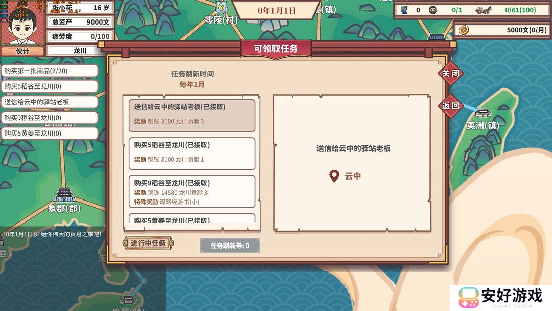 一开始我直接选择前往和云中村同路线的城市买稻谷,却忽略了路途上不少城镇都有送信任务接,如果路线规划好的话,可以顺道完成这些送信任务。想要最大效率利用时间的话需要在路线上的每一个城镇都停下来查看当前城镇的任务,然后进行大量数值路线计算与规划。