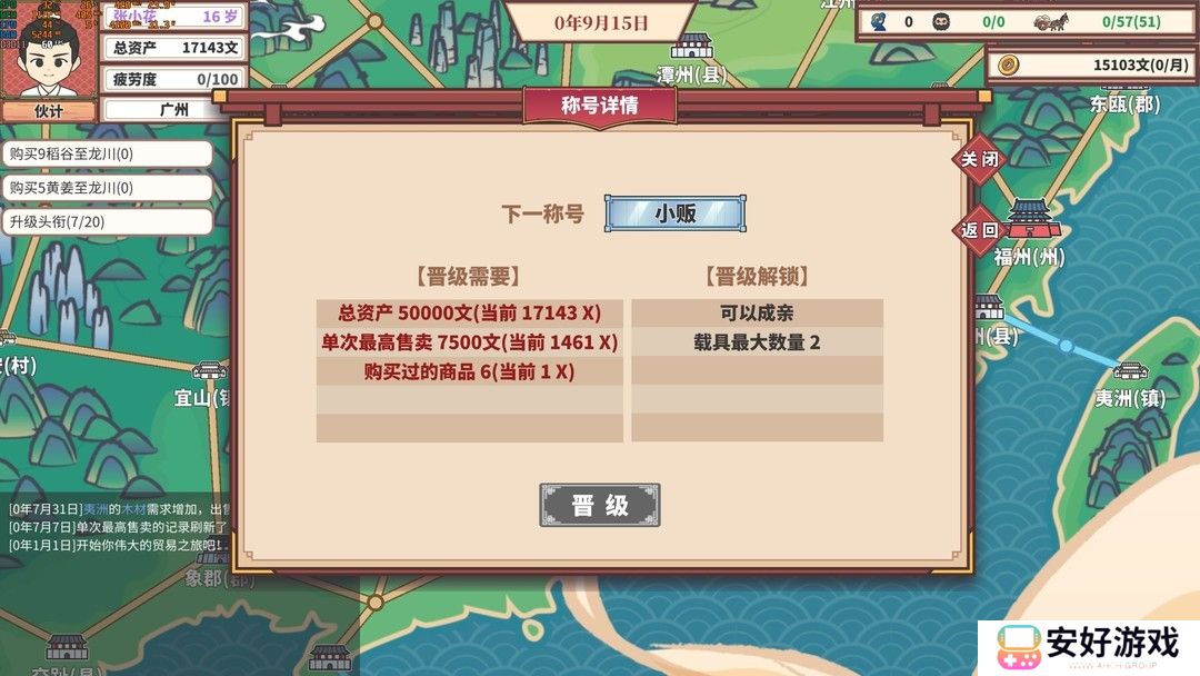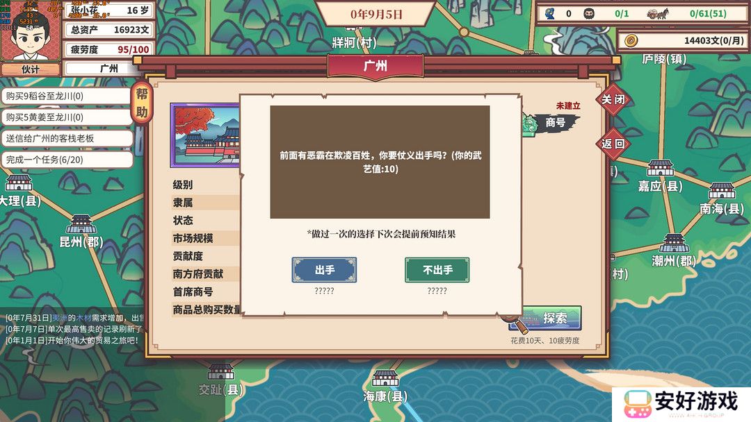 积累的资金达到一定程度后就能建立商号成立商队招揽人员加入。游戏的右上角有一个护卫能力与被劫匪关注度,一但关注度比护卫能力高的话应该会被劫道。