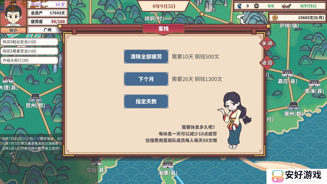 而每次运输移动都会增加任务的疲劳值,可以前往任意城镇的客栈花费铜钱和时间恢复疲劳值。