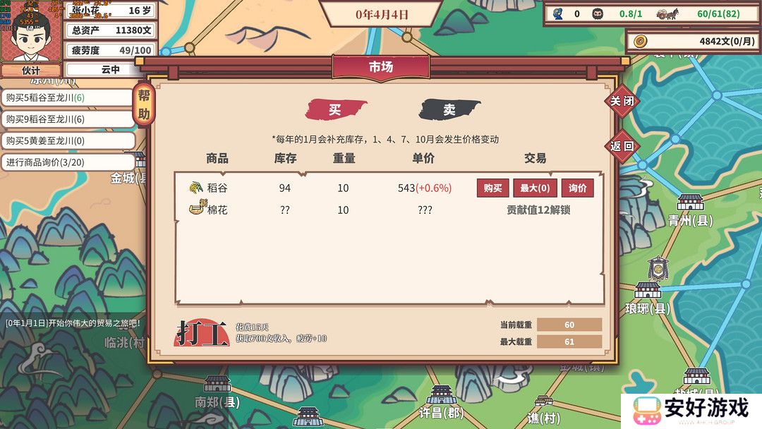 这里要注意同时最多接取5个任务,不要像我第一次玩这样直接接完一个城镇的任务,那些超过5件货物的任务最好先不要接。接着,先去完成运送稻谷的任务后,可以点击任务列表的货物按钮查看哪个城镇有稻谷贩卖。