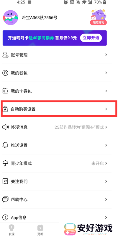 2、然后找到“自动购买设置”,找到相应自动购买的漫画取消即可。