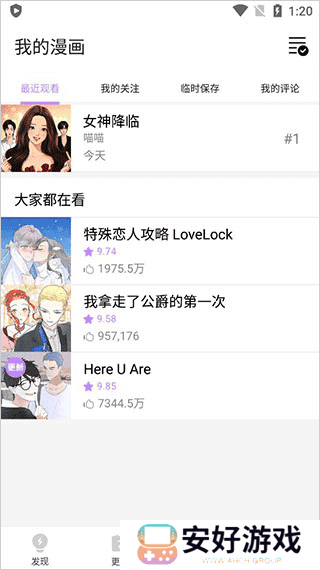 5、切换到我的漫画,可以看到我最近看的漫画,以及我的关注、临时保存、我的评论内容。