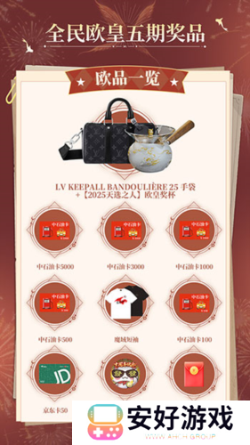 本次特等奖绝对是全场焦点!那闪耀着时尚光芒的 LV KEEPALL Ba ndOULIÈRE 25 手袋,无论是商务出差还是休闲旅行,都能彰显你的不凡品味。再加上独一无二的【2025 天选之人】欧皇奖杯,这份荣耀足以让你在魔域世界和现实生活中都成为众人瞩目的焦点。想象一下,手捧奖杯,肩挎 LV 手袋,走在街头,你就是最耀眼的存在!