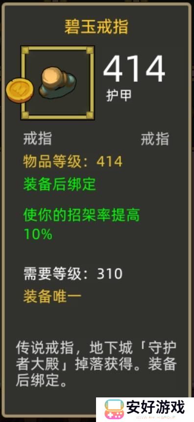 戒指需要碧玉戒指来补充10%招架率,想要带输出型戒指,可以把上面的闪避匕首换成30%招架的,这样堆叠伤害要略高一些,闪避会低10%。另一个戒指带枯叶或者战争印戒即可,不想升级枯叶的话,就刷战争印戒就行。