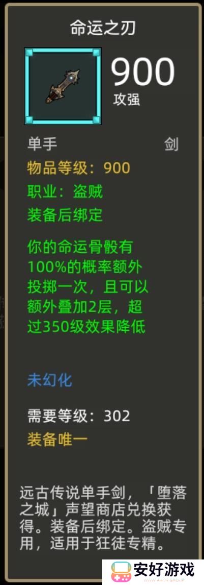 另一把武器推荐本命蓝武命运之刃,需要300封印碎片在堕落之城声望商店兑换,效果是命运骨骰可以一次投掷两次,两次都触发命运雕文的上限非常可观,下限两次三选一也完全能够接受,玩狂徒贼的小伙伴可以攒碎片换一个。