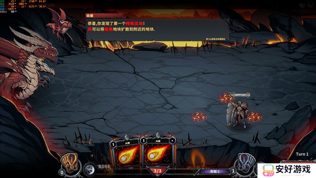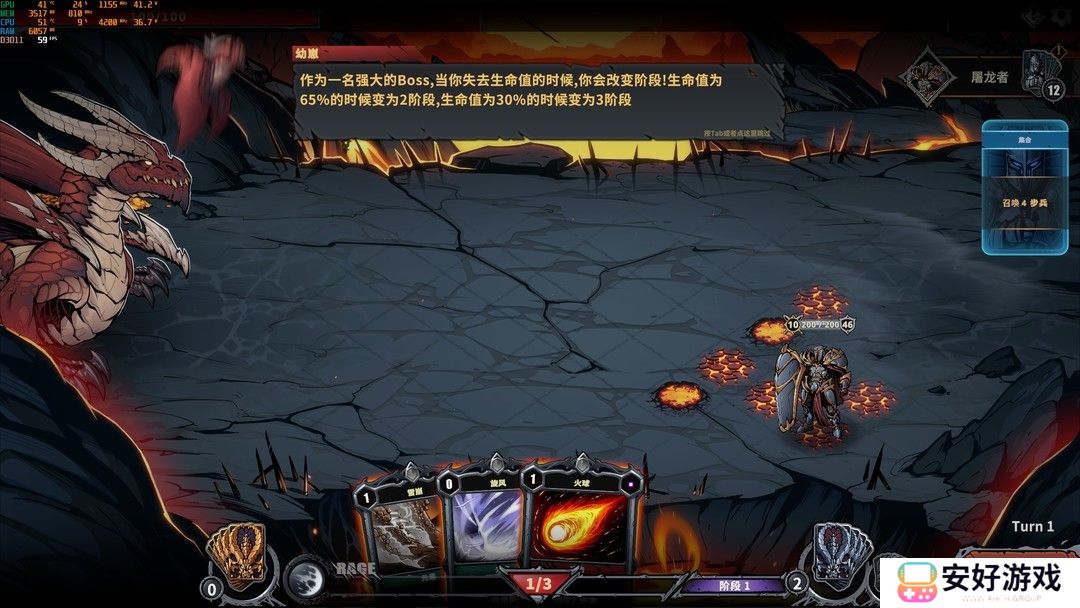 然后点击开始游戏,直接进入新手教程,根据操作提示了解游戏玩法。玩家控制的是一条boss级巨龙,每回合有三点行动点,卡牌左上角的数字表示使用这张卡牌所需消耗的行动点数,点数不够则无法使用该张卡牌,默认没有预扣下回合行动点数的功能。