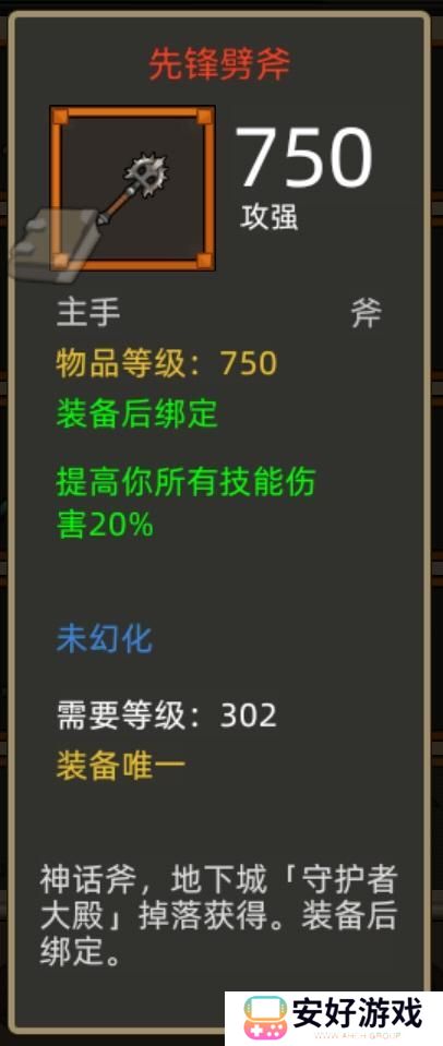 主手推荐守护者大殿的先锋劈斧,提高20%技能伤害,也可以考虑魔能宫殿掉落的掠食者利斧(50%暴击伤害提升),技伤斧收益更为稳定,爆伤斧辐射到了普通攻击,上限更高。
