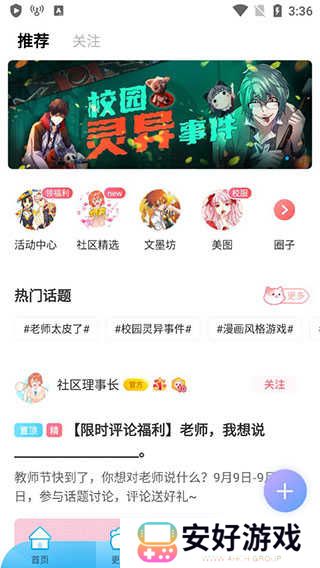 5、切换到漫画台,这里是有关该软件的热门话题的,还包括美图、社区精选等。