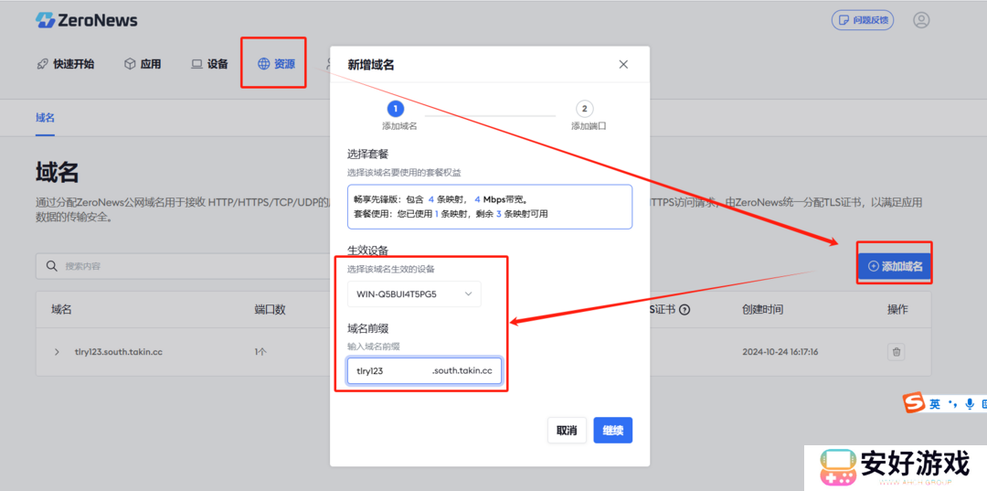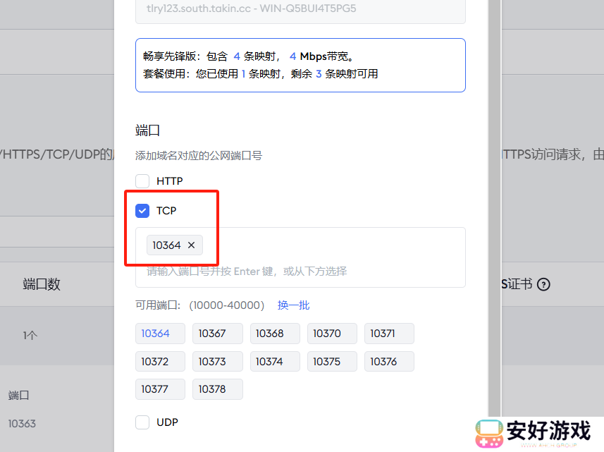 然后在ZeroNews用户后台配置自定义域名,可以输入简单易记的域名,并添加一个TCP的端口,端口根据推荐选择一个即可