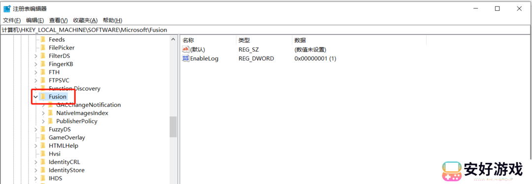 然后按路径HKEY_LOCAL_MACHINESOFTWAREMicrosoftFusion找到Fusion文件夹