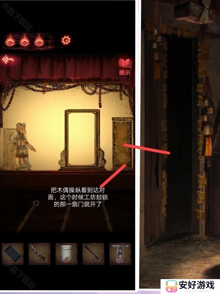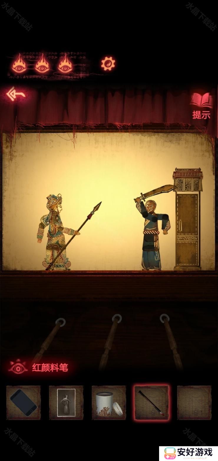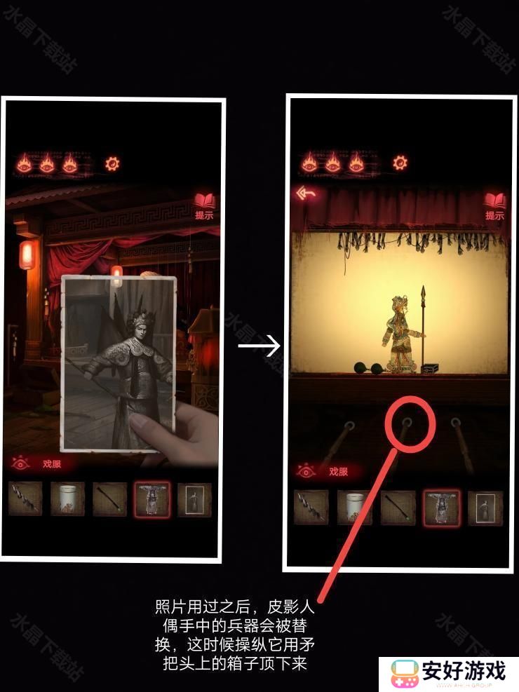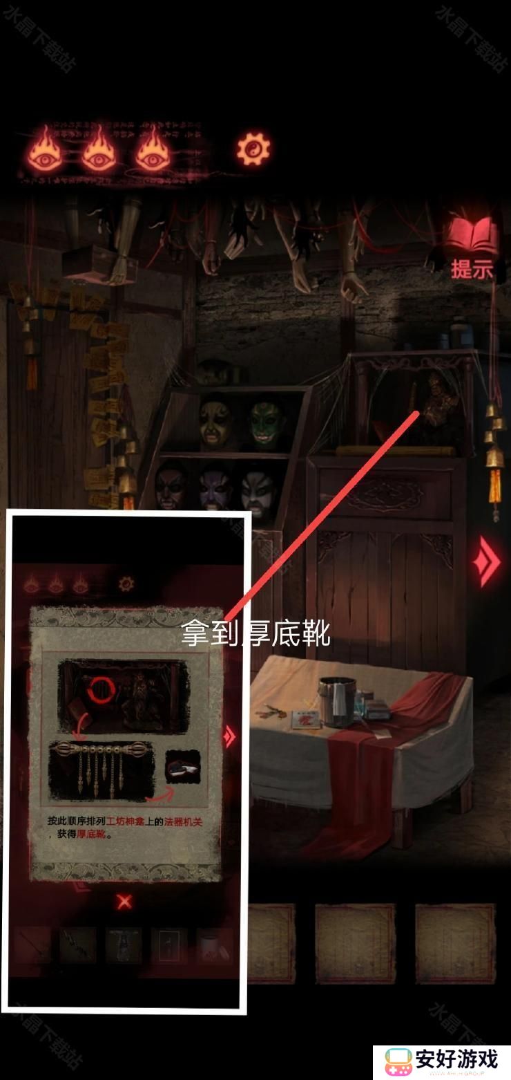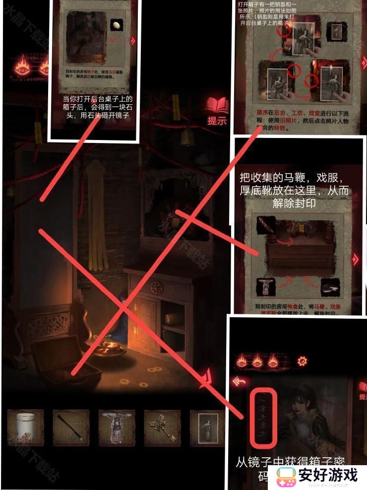 8、然后按照这个密码拿到厚底靴,按照图四:把靴子,马鞭,戏服放在那个位置,解除封印.皮影人偶便可以活动了