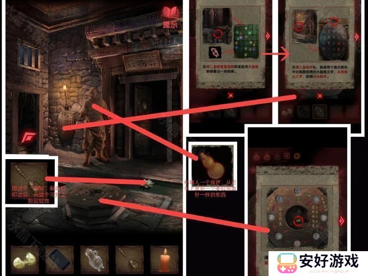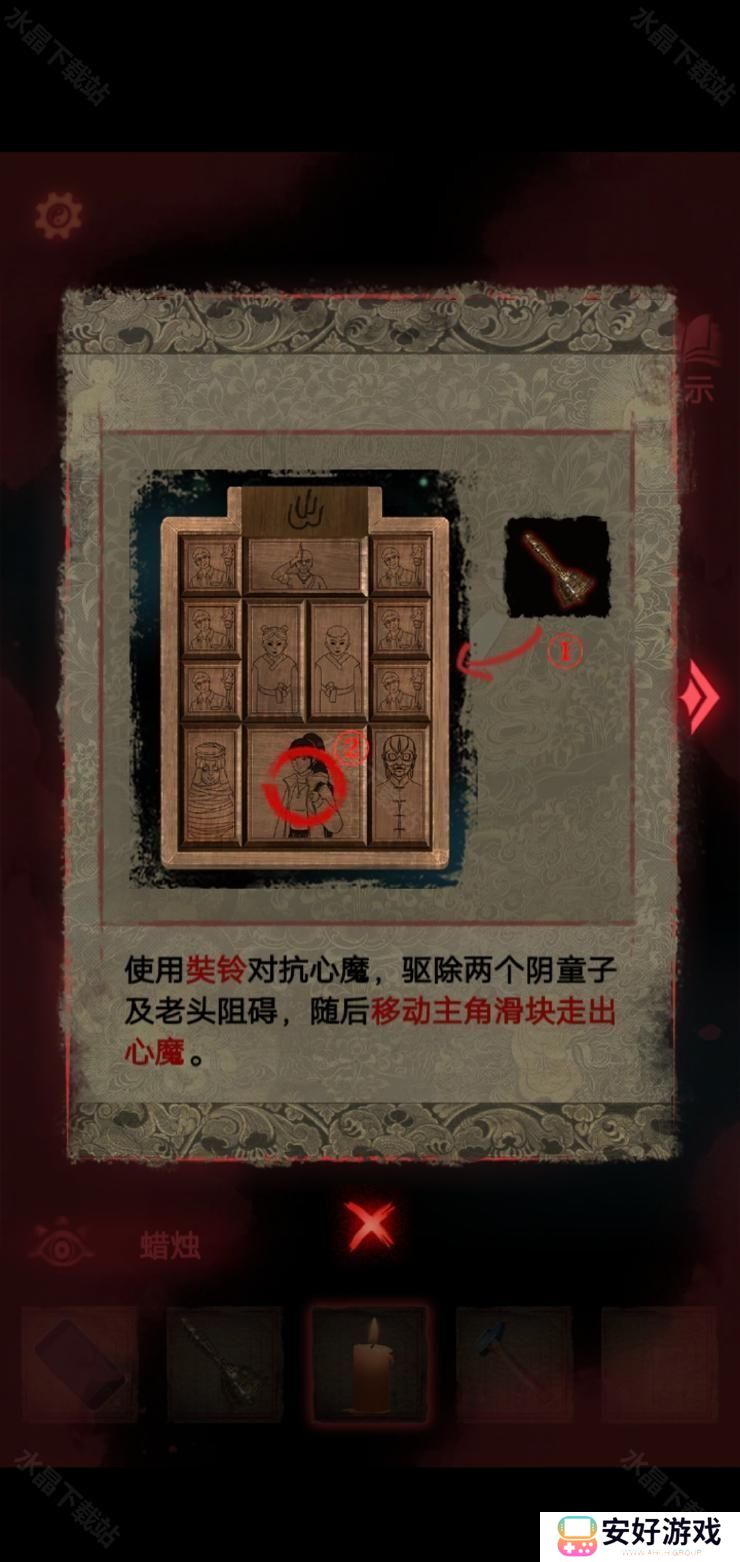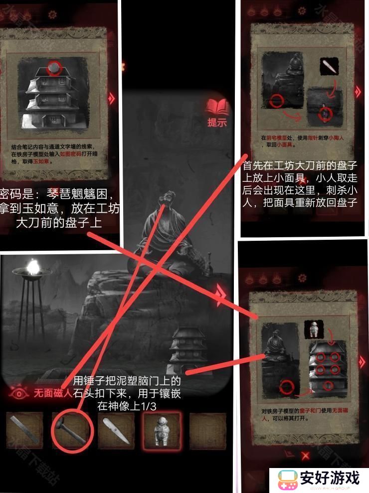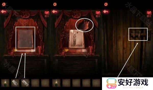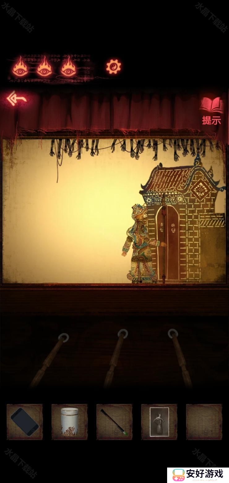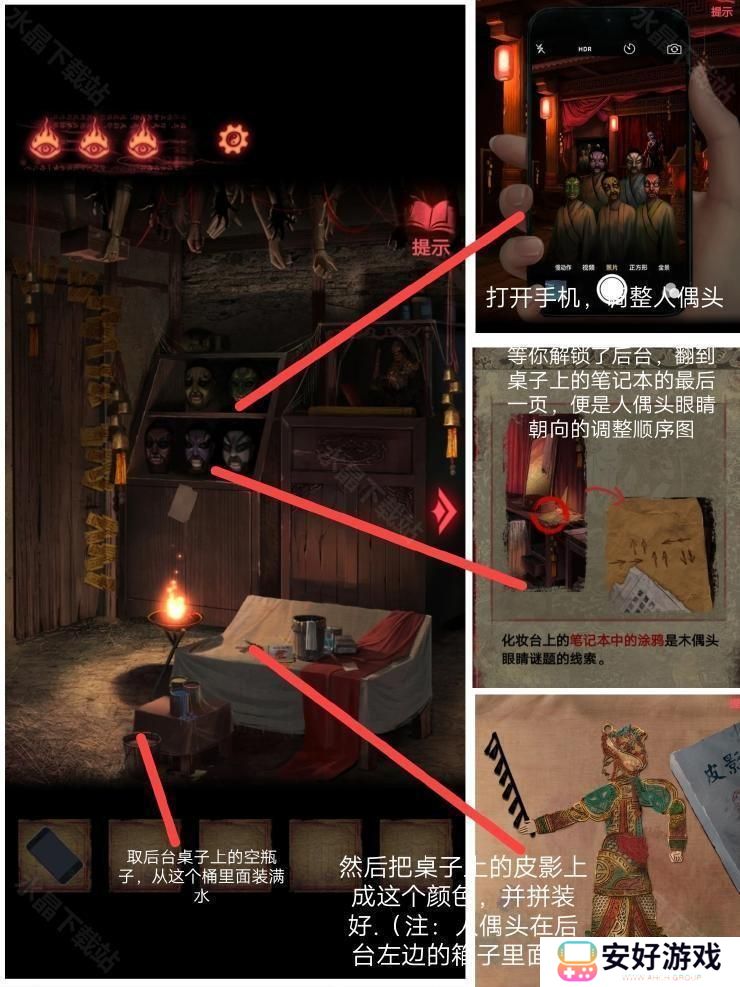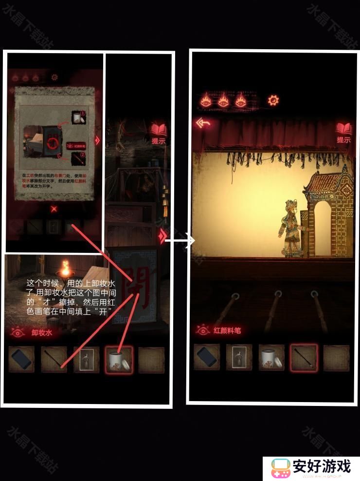 8、然后按照这个密码拿到厚底靴,按照图四:把靴子,马鞭,戏服放在那个位置,解除封印.皮影人偶便可以活动了