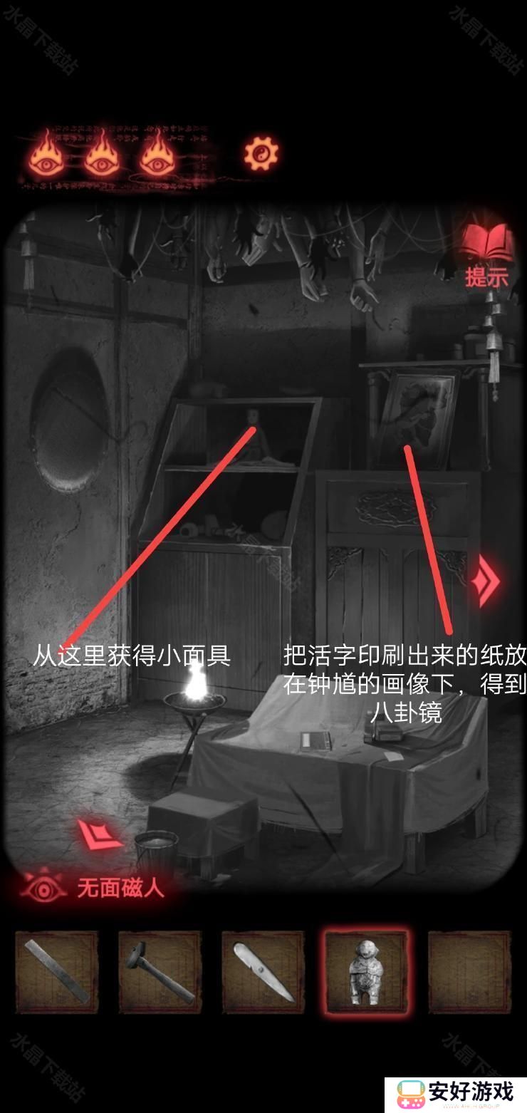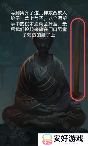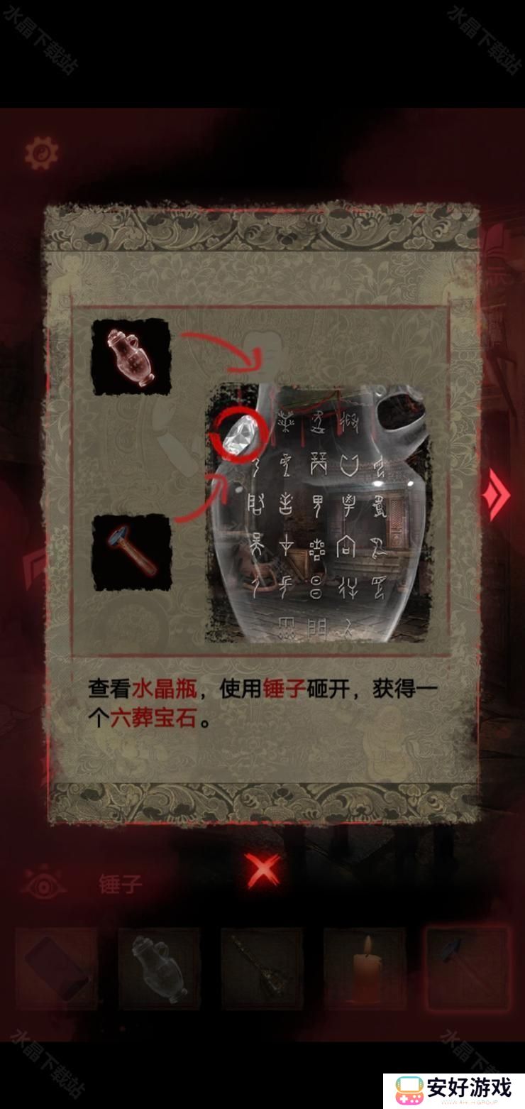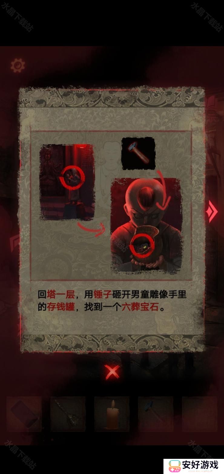 在封煞殿按照正确顺序点燃蜡烛,放上玉石后从神龛里面的夹层取得锤子.
