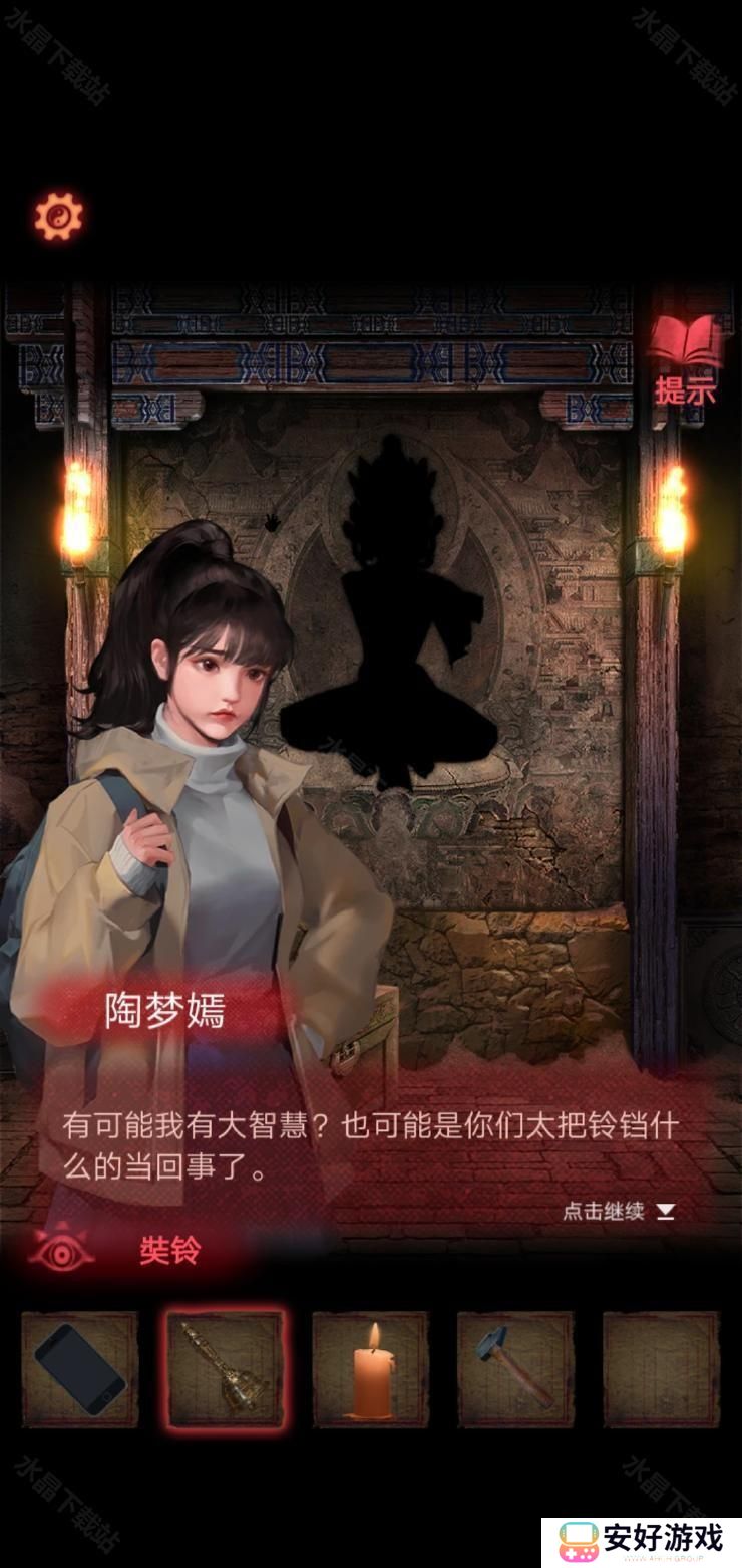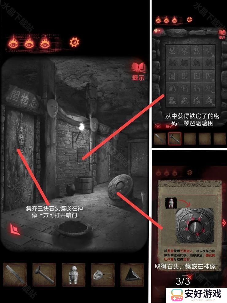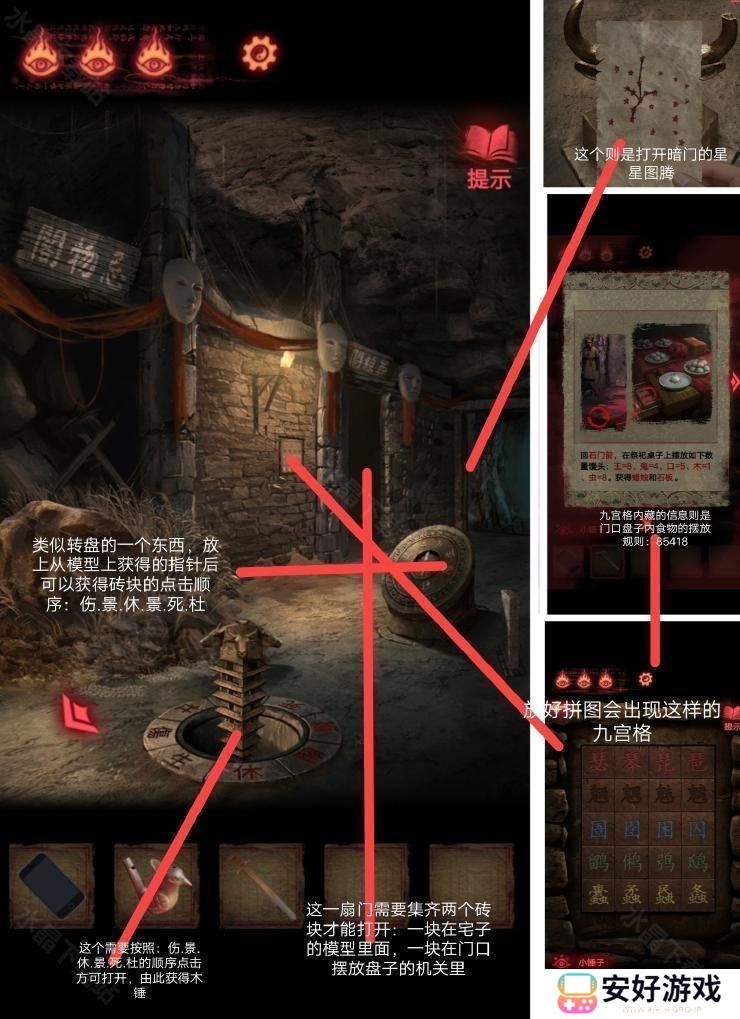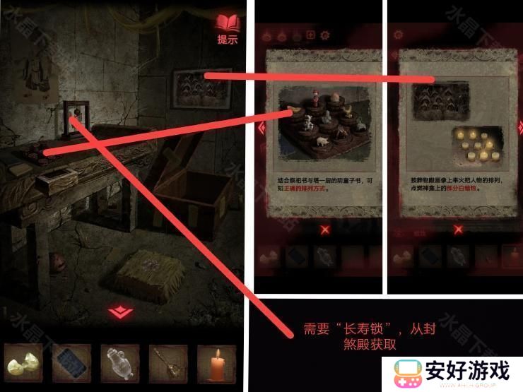 在封煞殿按照正确顺序点燃蜡烛,放上玉石后从神龛里面的夹层取得锤子.