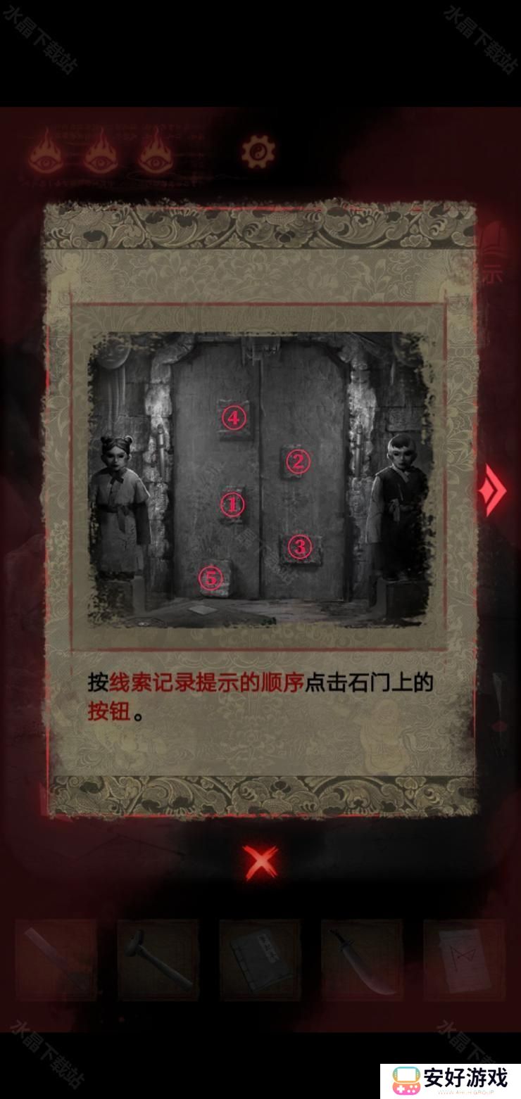 7、这个时候拿到墙上那一柄大刀后,这个地方就会坍塌.拿着刀砍掉戏台上的木偶,便会得到一个奇怪的符号,这个时候退回到门口.梁少平说关门的机关在童子的眼睛上,关门后按照这个顺序点击按钮;