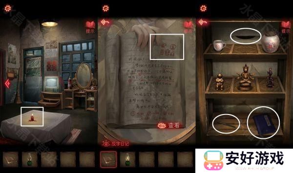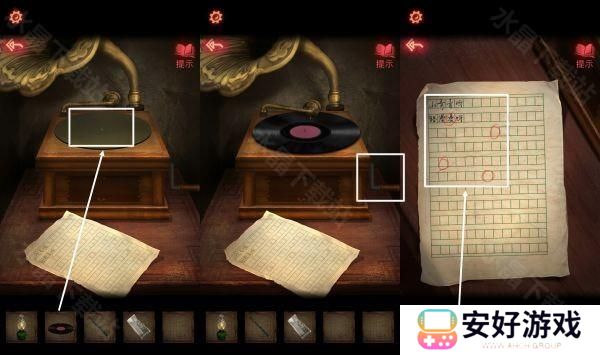 9、煤油灯把桌子上的蜡烛点燃,进入房间之后,根据日记本提示,调整架子上面的物品,会得到【唱片】,架子上有【铅笔】,日记本后面【半张照片】。