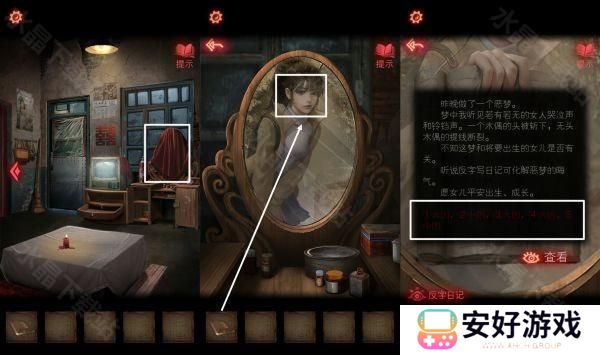 7、镜子上面的红布拿掉,用镜子反射日记本,得到线索。