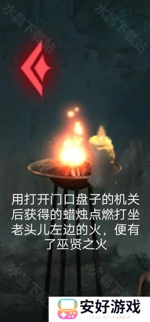 2、用打开门口盘子的机关获得的蜡烛,点燃打坐的火;
