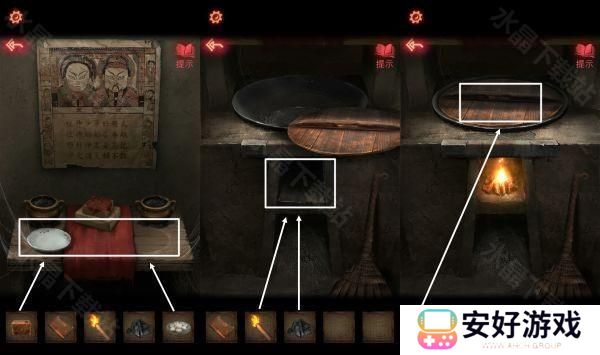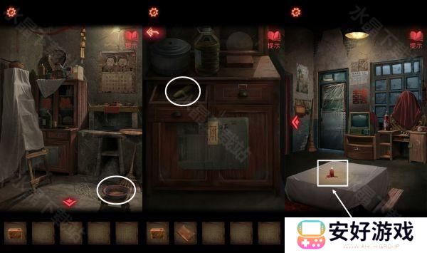 1、在梳妆台下面柜子柜门上面根据图画上面的编号1.衣服 2.树 3.月亮 4.佛像,打开锁里面有一盒【枣糕】。