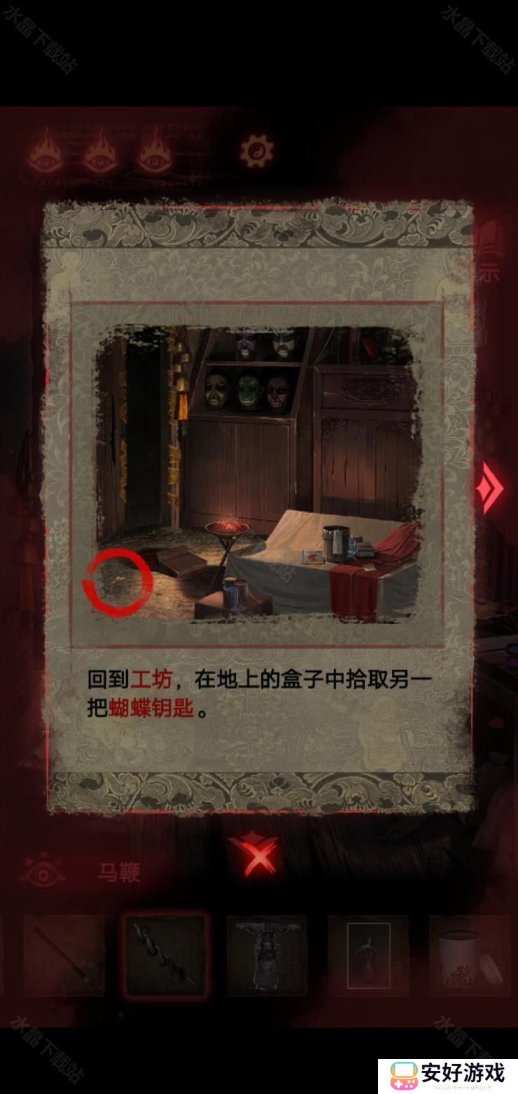 7、箱子里面装着钥匙,这个时候我们回到工坊,钥匙掉下来了,可以打开后台桌子上的箱子.拿到石头砸碎镜子;
