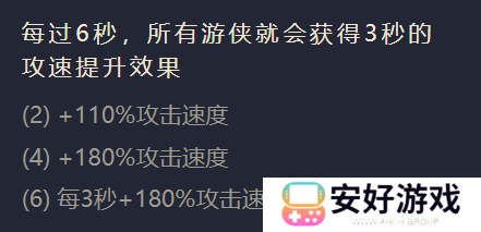 当同时拥有二个游侠、四个游侠、六个游侠的时候羁绊效果分别为:所有游侠将获得每过6秒110%、180%、每3秒获得180%攻速提升(如下图所示)