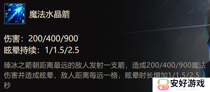 3、技能效果:臻冰之箭朝最远目标发射一支箭,1星时、2星时、3星时对当前敌人分别造成200伤害眩晕1秒、400伤害眩晕1.5秒、900伤害眩晕2.5秒。(如下图所示)