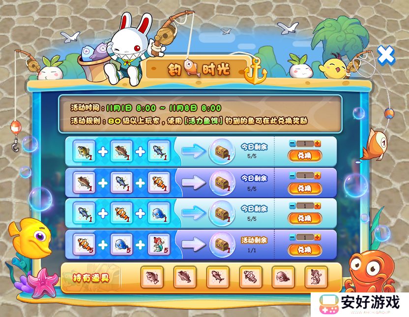 一定数量和种类的鱼可以用来兑换活动宝箱,《希望OL》钓鱼时光活动宝箱可以开出各种药水和道具,还有几率开出钓鱼时光活动限定称号梦境河钓客。