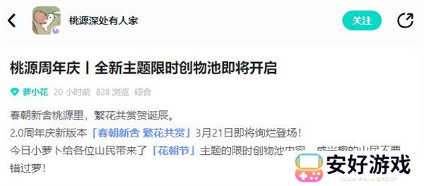 桃源深处有人家的2024年周年庆即将到来,有不少玩家还不是很清楚桃源深处有人家2024周年庆是什么时候,桃源深处有人家的周年庆是在每年的3月22日,接下来就是小编为玩家带来的2024周年庆最新日期活动的介绍,感兴趣的玩家快来一起看看吧!