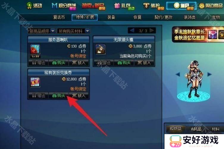 道具商城的【特殊/扩展】中可以购买装扮兑换券,需要12800点券(128元)。