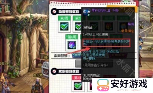 周签到会送出累积签到礼盒,里面有稀有装扮兑换券。