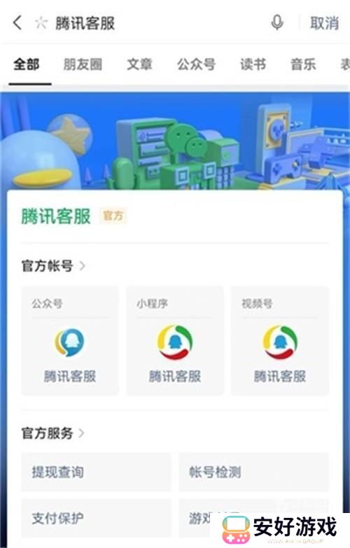 1、首先打开微信app,搜索并关注【腾讯客服公众号】。