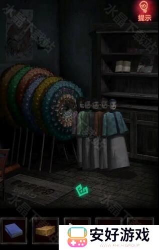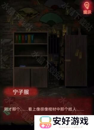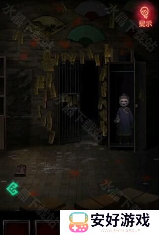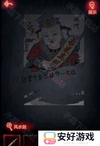 11、我们到纸人那点击后面年画,用宝剑打开画获得密码提示,密码是地下室上面扇子的密码。