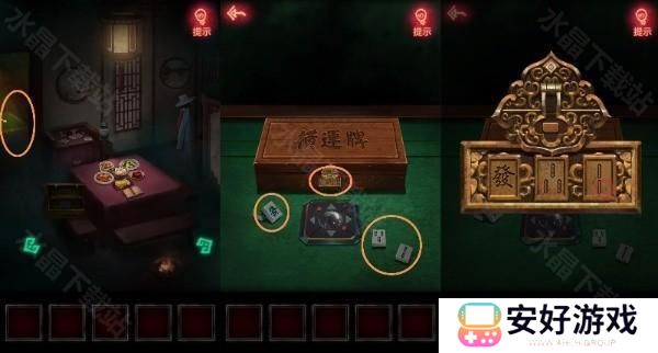 8、我们在麻将桌上打开箱子,根据3个麻将密码:发财、三条、二条,打开箱子获得钥匙。
