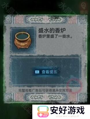4、在城隍庙点击最中间桌子,在桌面阴世录旁拿个空香炉,用空香炉点击水缸即可获得水。