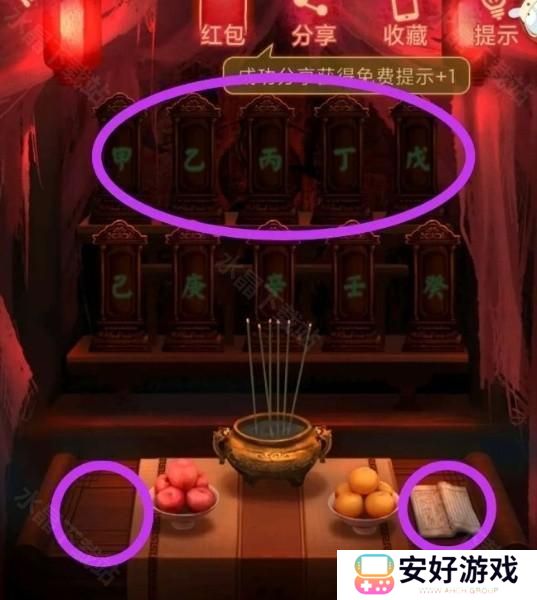 1、首先我们到右边小祠堂,看桌子上线索,了解摆放牌位顺序打开机关。