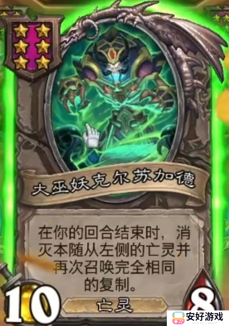 克尔苏加德的效果是回合结束消灭左侧的随从,并且召唤完全相同的复制,可以和上面的蛛魔之王阿怒巴拉克,打配合刷攻强阶段来的早可以考虑拿一个。